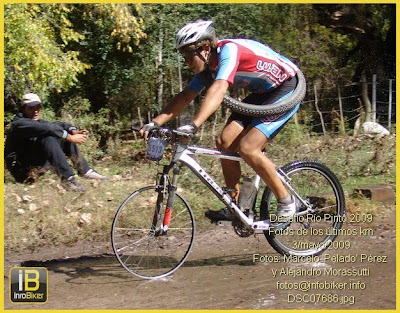 …Luego de la bajada me tomo un gel y para pasarlo con agua agarro la caramañola, había un pequeño desnivel hacia abajo, errorrrrr, vino una curva y luego una piedra, me la comí de lleno, clavé los frenos instintivamente y durante la milésima de segundo en la que iba cayendo lo primero que se me pasó por la cabeza fue que no iba a poder terminar. Todavía no se como caí, creo que los cuernitos me golpearon el pecho, sentí que alguien me gritaba “vamos!!! Fuerza!!!”, me levanté y no sentía ningún dolor (supongo que de la misma adrenalina), me subí a la bici y seguí, agradeciendo que no había pasado nada….