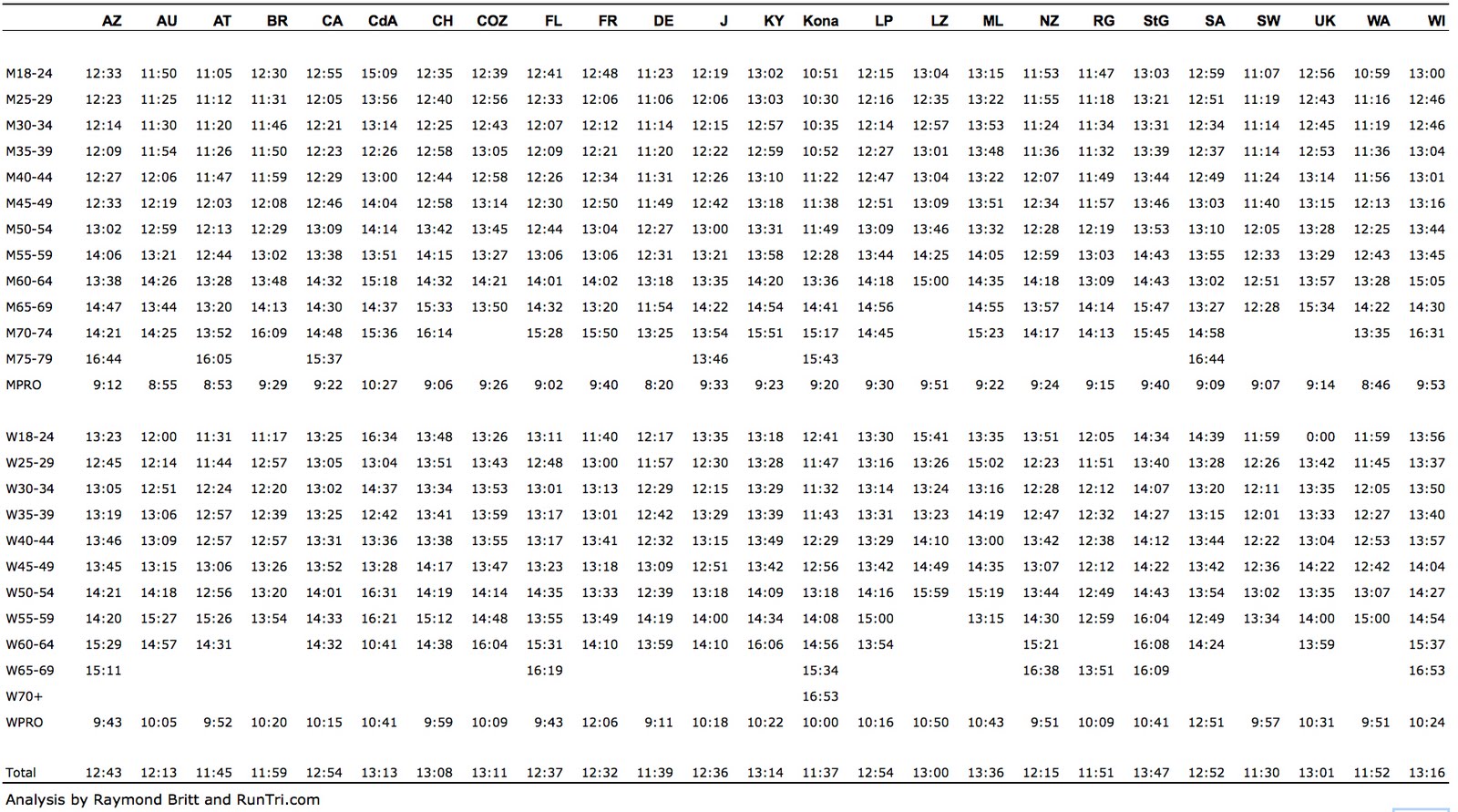 En su publicación “Hardest Ironman Course” Raymond Britt publica una serie de datos estadísticos que permiten comparar la “dureza” de los circuitos Ironman de todo el mundo desde un punto de vista cuantitativo.