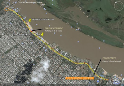 •Olímpico: desde el parque cerrado, tomando Av. Carrasco hacia el norte hasta la rotonda debajo del puente ROSARIO VICTORIA, girando 180º retomar la misma por mano contraria hasta Av. de los Trabajadores (Parque Alem). De allí girar 180º y volver hacia el norte nuevamente por Av. Costanera hasta el parque cerrado. Este circuito mide 10K por lo tanto se repetirá 4 veces.