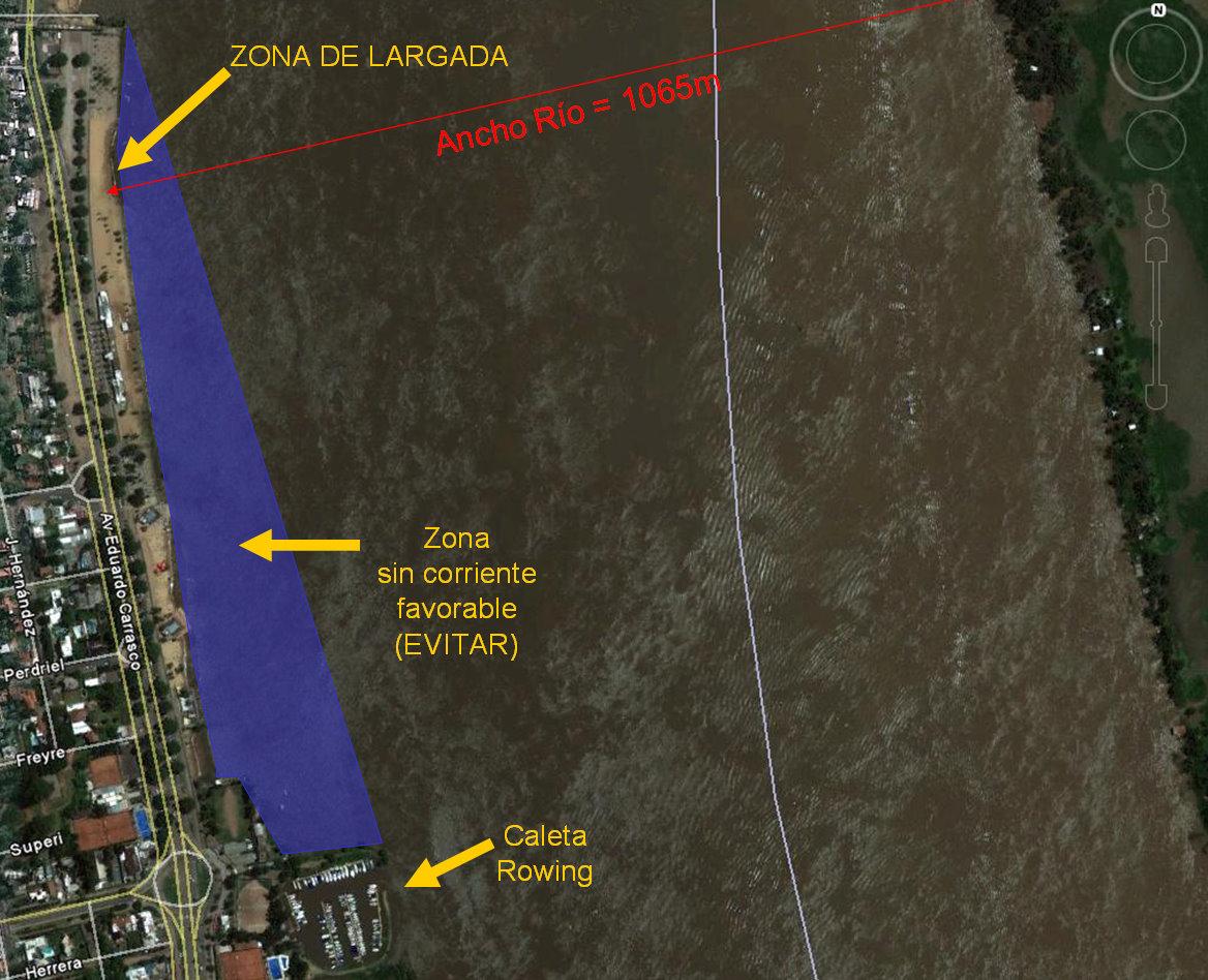 Al ser zona de playa no hay prácticamente presencia de corrientes favorables (velocidades inferiores a 0,6m/s o nulas) , por lo que (como se ve en la web del organizador de la carrera), es IMPRESCINDIBLE largar con dirección a la costa contraria alejándose al menos 200m de la costa lo más rápido posible. Esto permitirá al triatleta ubicarse en posiciones de corrientes favorables aprovechándolas en toda su magnitud.