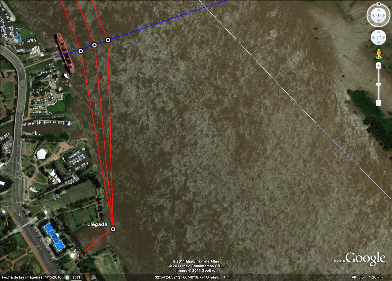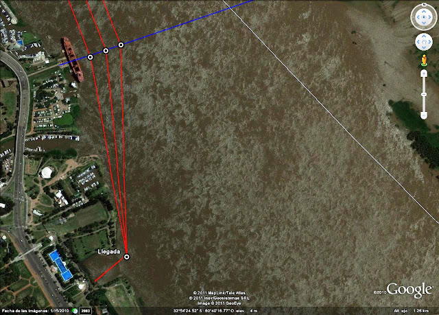 Esta es la zona del recorrido donde el Río presenta su mayor estrechez (880m de costa a costa) y por lo tanto la mayor velocidad superficial. Además, recién a partir de este punto podremos divisar la zona de llegada para modificar nuestra dirección.