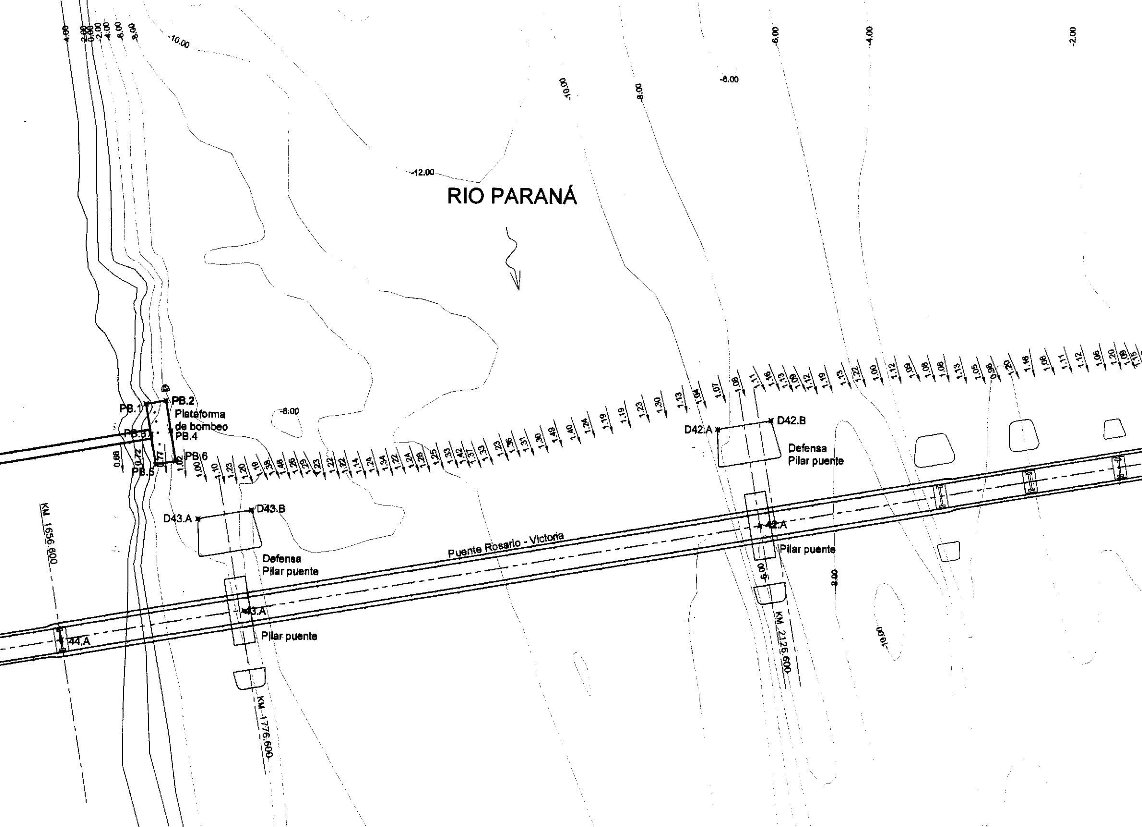 Para el presente análisis se utilizaron estudios topobatimétricos (perfiles de fondo y alturas) e hidraúlicos (velocidades) realizados recientemente en el Río Paraná para el emplazamiento de una nueva toma de agua cruda.