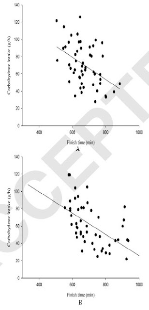 -Algo que no se detalla en la gráfica pero que sería importante conocer es: cuantos de los que tuvieron baja ingesta de CHO se vieron obligados a esto por problemas gastrointestinales ya en las primeras etapas de la prueba. Es muy usual que las descomposturas empiecen en el ciclismo, por los nervios, el viento en el estómago mojado, etc. , y esto perjudica generalmente toda la carrera.